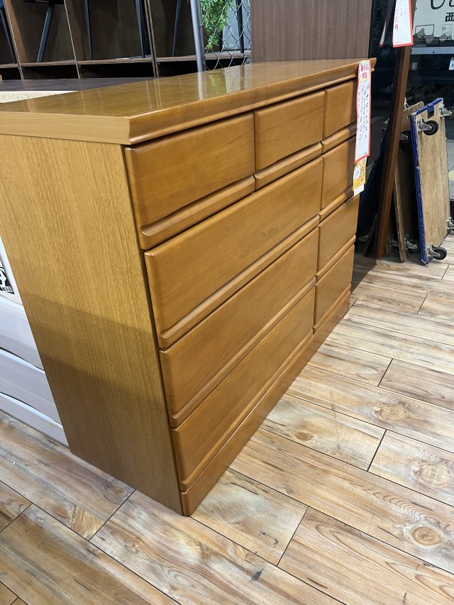木目の美しさが際立つ、シンプルデザインのワイドチェスト。