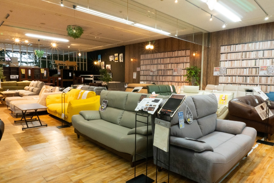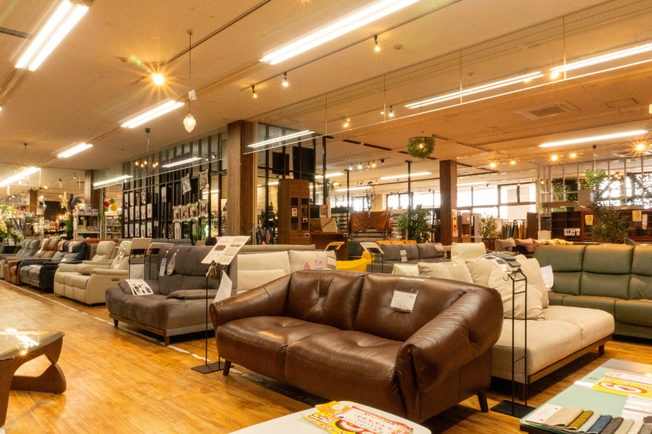 店内には、機能性に優れたソファやダイニングセット、素材にこだわった家具などを実際に見て触れて選べる展示が充実。